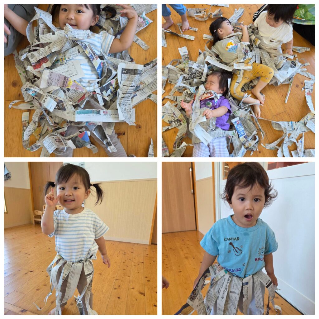 新聞紙遊びをしました✨️ビリビリ新聞紙を破るのはもちろん、破った新聞紙をお友だちにかぶせるのも楽しくて、ダイナミックに楽しみました!!新聞紙のお洋服で、はい、ポーズ♡