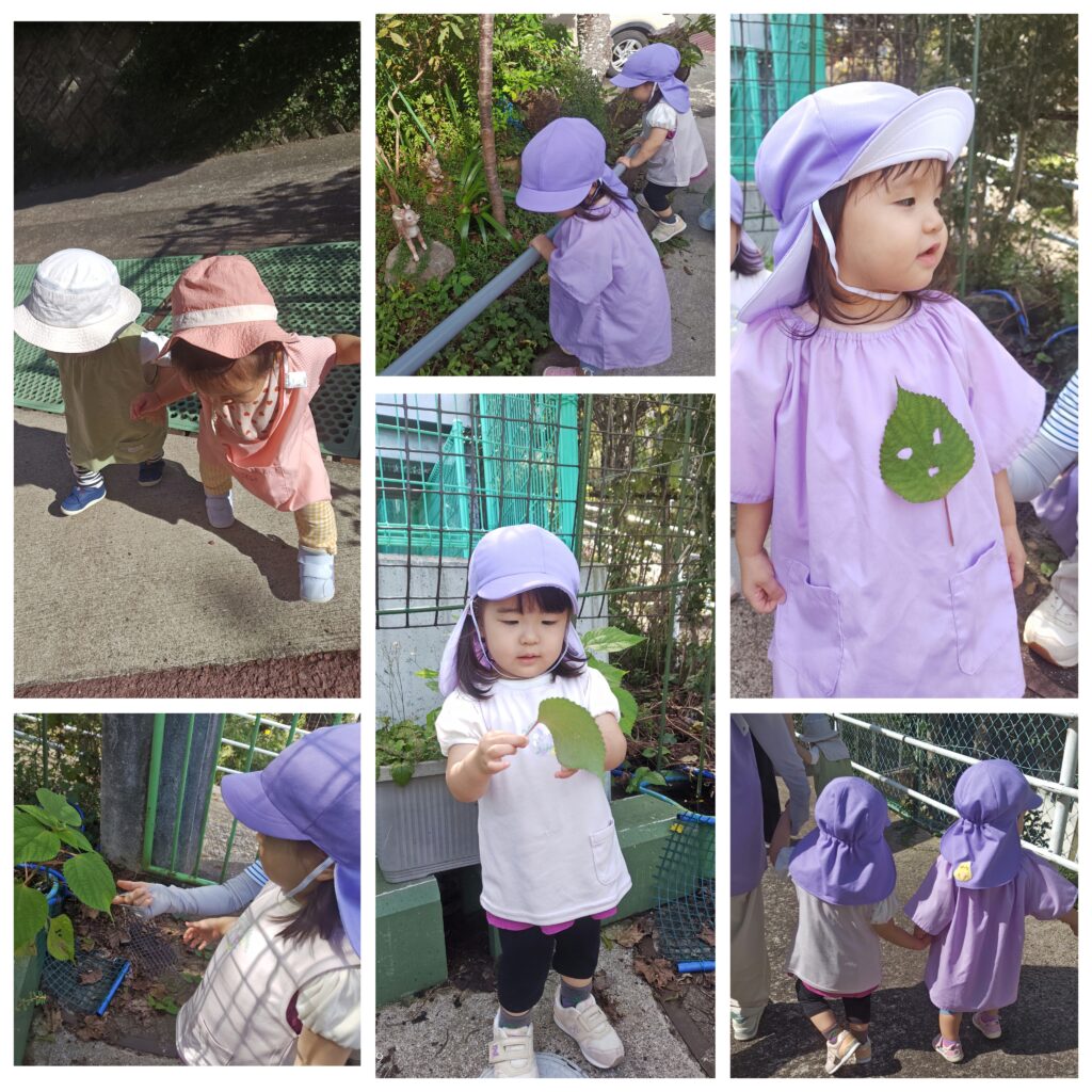 9月に比べると、少しだけ涼しくなり、みんなで幼稚園の周りにお散歩に出掛けました♡お友だちと手をつないで歩いたり、葉っぱやまつぼっくりの赤ちゃんを見つけたり(^o^)歩くのも、力強くなってきました!