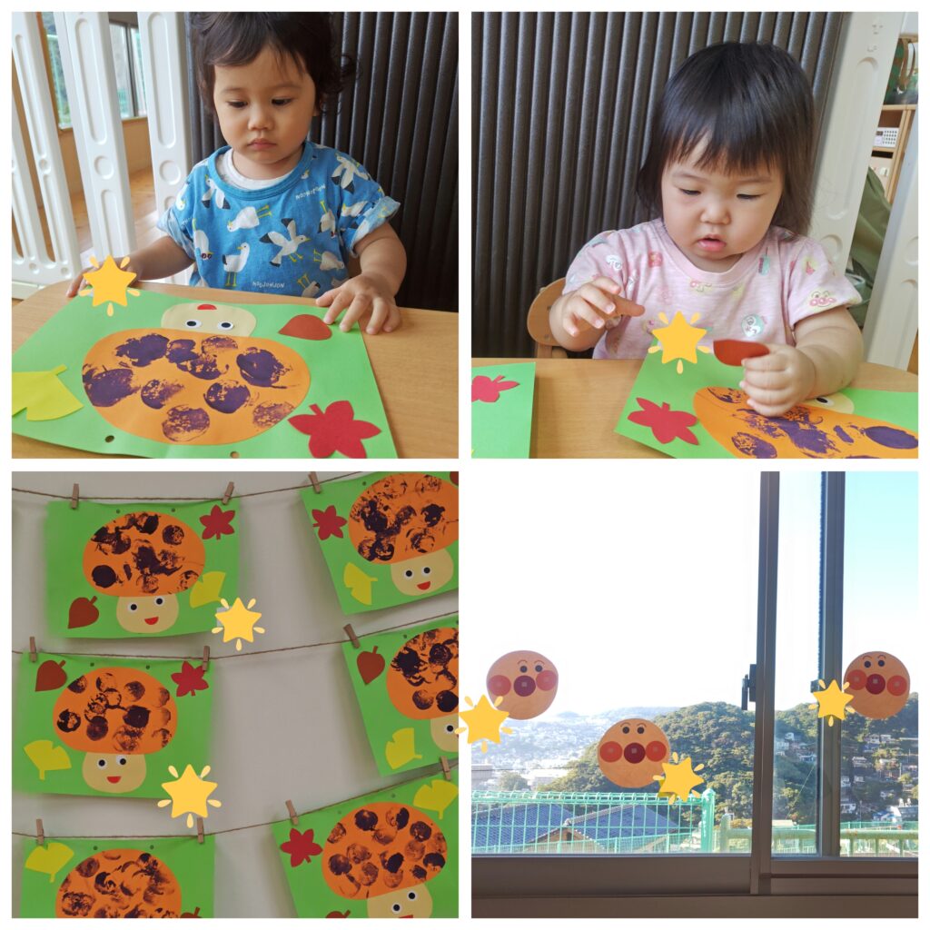 以上児のお友だちから、お芋ほりのお芋のおすそわけをいただいて、スタンプ遊びを楽しみました😄スタンプを楽しんだあとはキノコに変身✨️大好きなアンパンマンの製作にも、みんなニコニコで取り組みましたよ!
