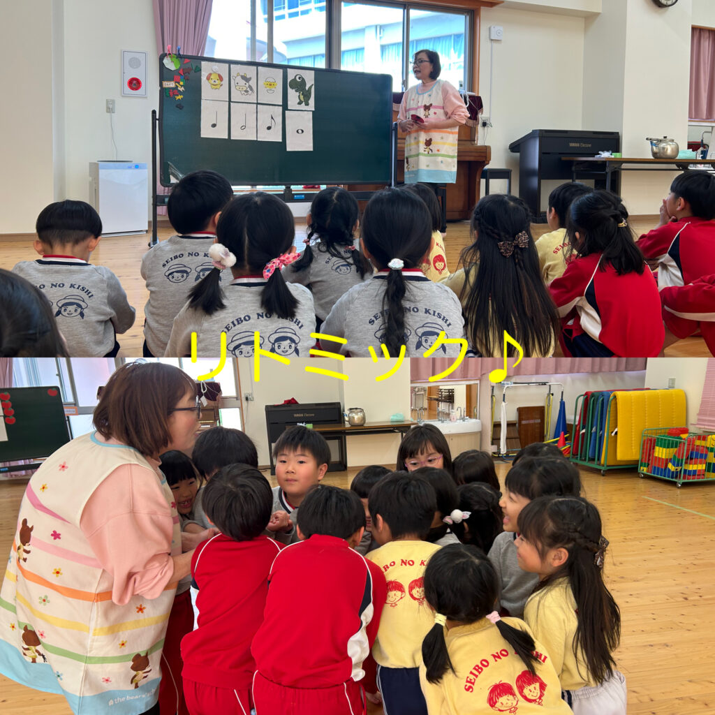 全音符、二分音符、四分音符など教えていただき、リズムに合わせて体を楽しく動かしました😊