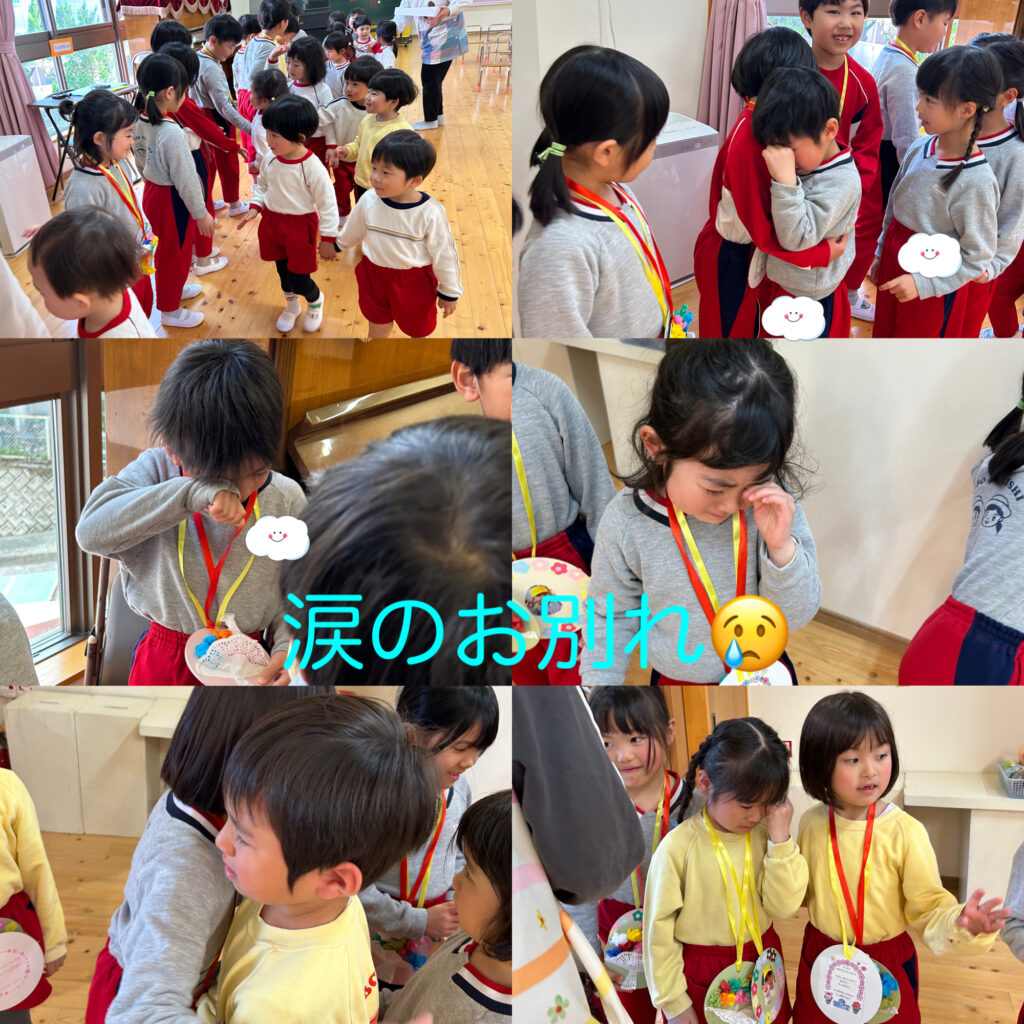 プレゼント交換を行い、ハグをしたり、一つ下のさくら組さんは泣いて悲しむお友達も…😢